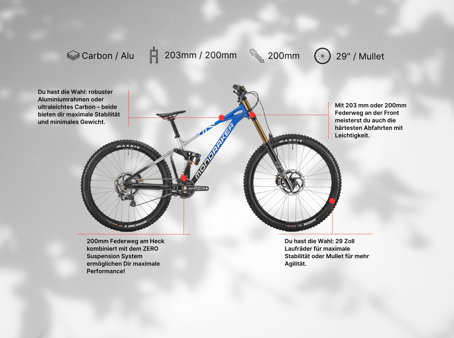 Le système ZERO Suspension est conçu pour l'efficacité et la performance maximale. Chaque modèle - du vélo pour enfants au vélo de descente vainqueur de la Coupe du monde - possède une géométrie développée individuellement. Avec son design Dual Link et son amortisseur "flottant", le système ZERO réagit de manière extrêmement sensible aux petites irrégularités tout en restant stable en cas d'impacts violents. Pas de perte de puissance, pas de kickback de pédale, pas de brake-jack - simplement une pure performance sur le trail. Le système ZERO de Mondracer fait de chaque vélo un véritable atout.