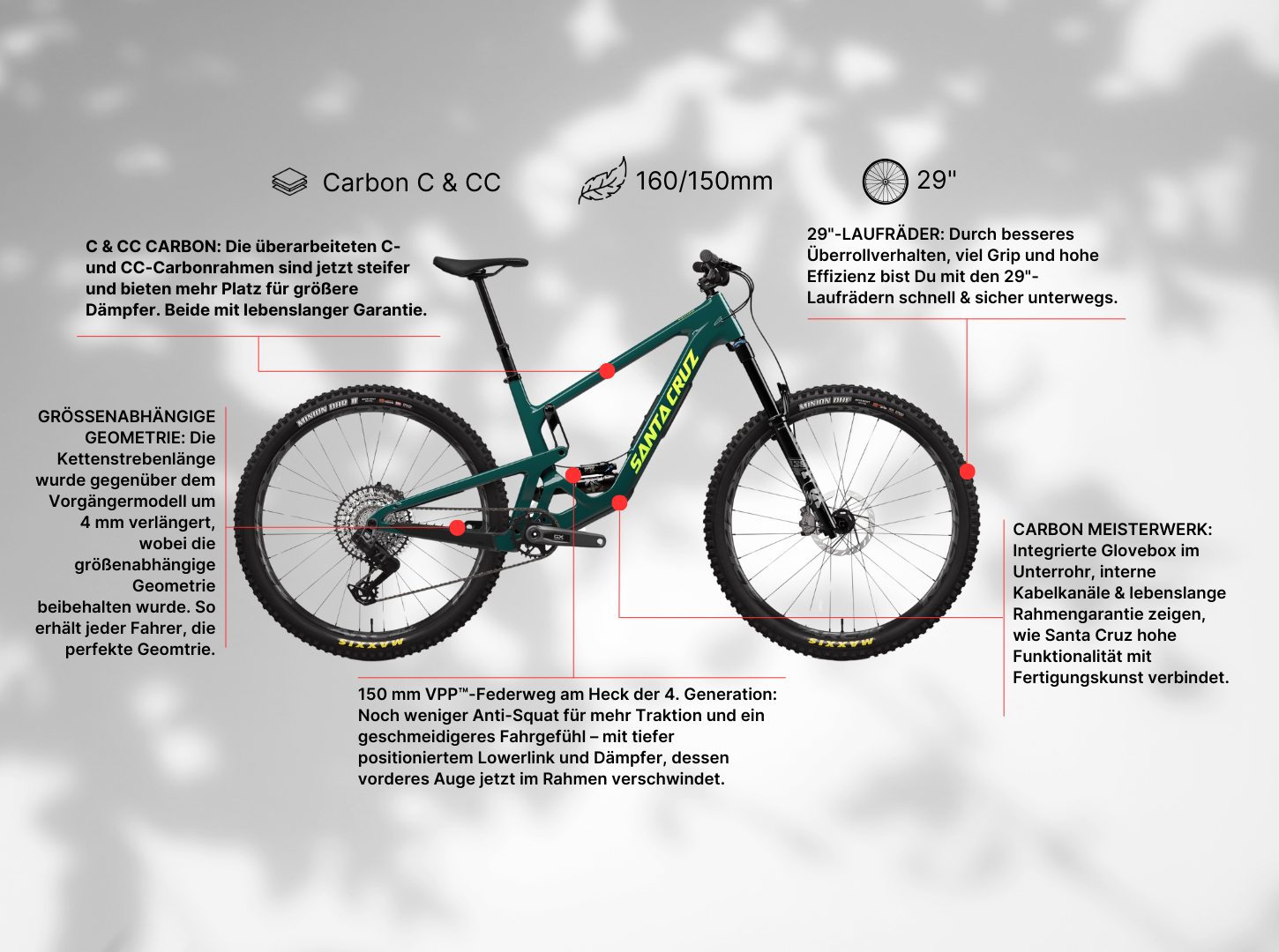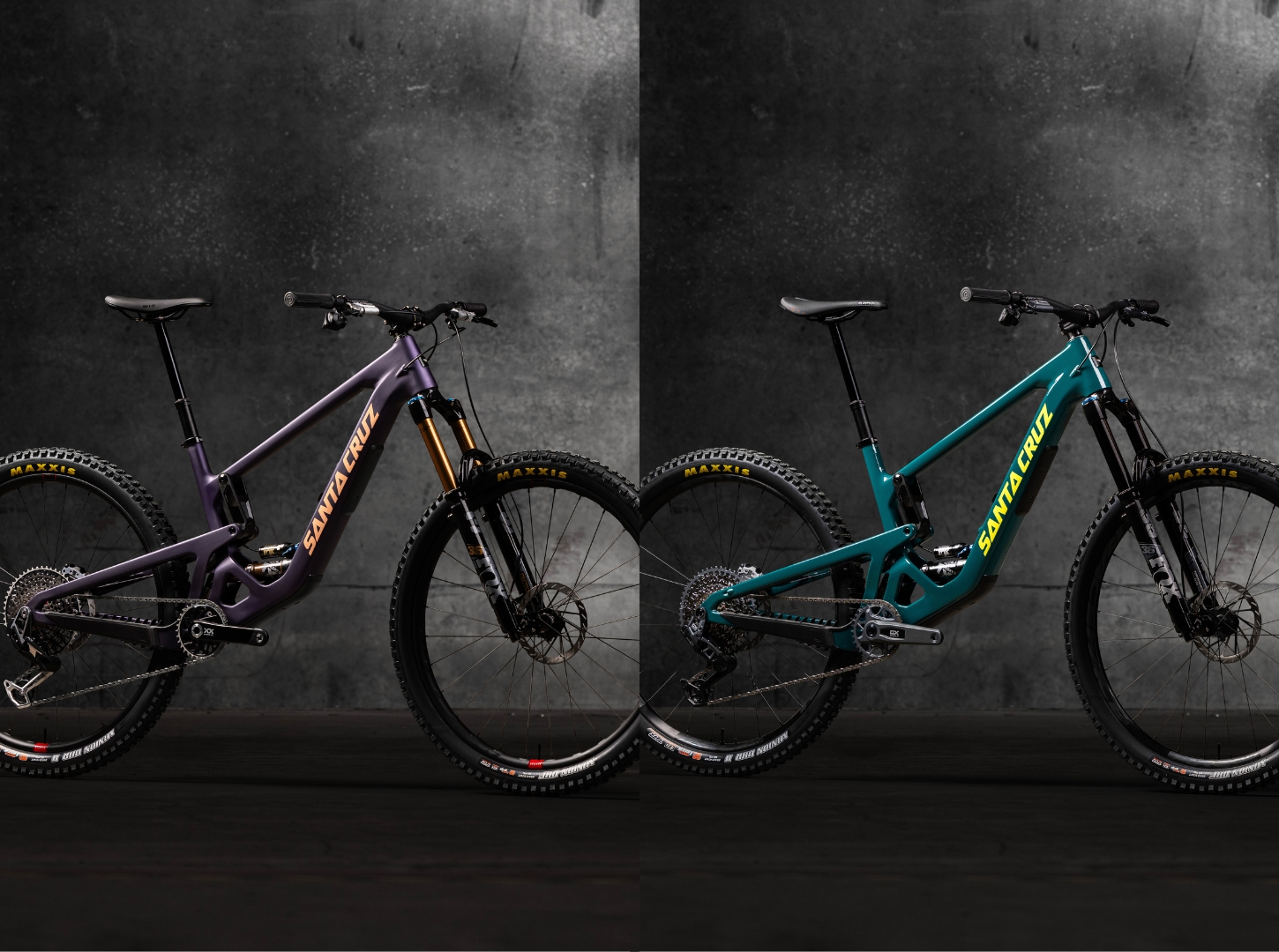 Le vélo est disponible en deux nouvelles couleurs, "Matte Deep Purple" et "Gloss Day Green", qui sont typiques de Santa Cruz et qui apportent un nouveau souffle à la palette de couleurs.
