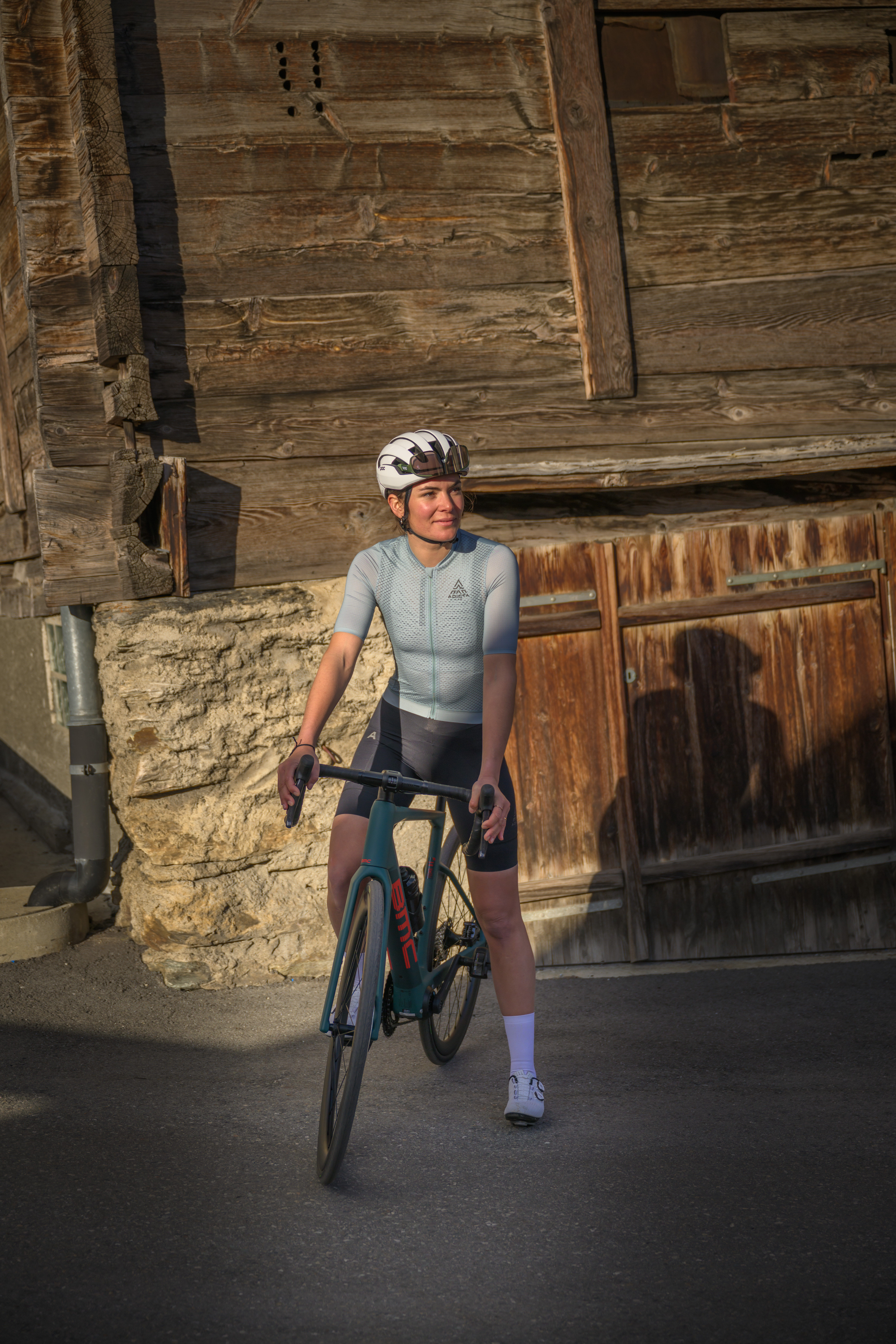 Le devant est composé d'un mesh très ouvert pour une aération maximale, le dos d'un mesh respirant qui évacue l'humidité. La coupe Race est ajustée, plus courte à l'avant et favorise une position sportive et aérodynamique sur le vélo.