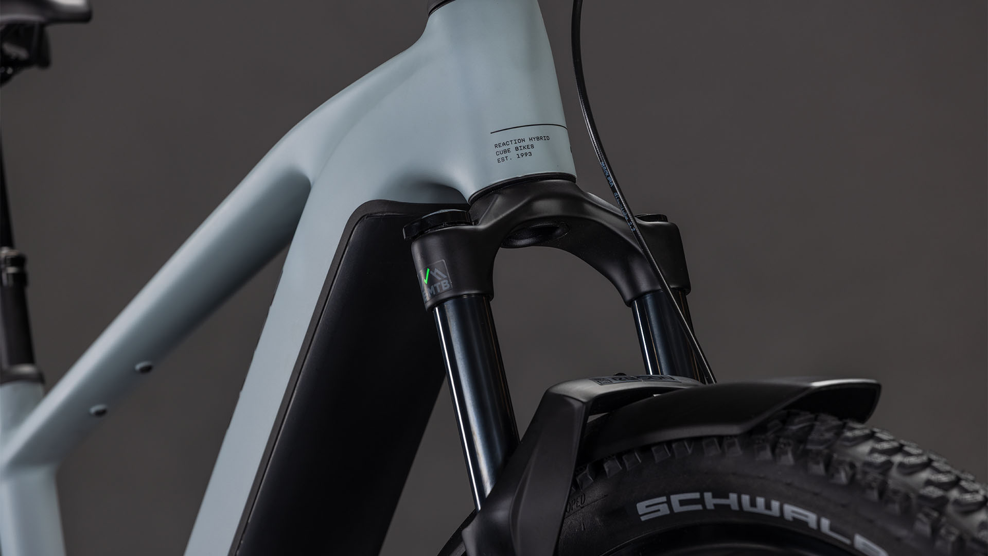 Le Reaction Hybrid Race FE est plein de détails pratiques. D'une part, il est équipé en standard de garde-boue, d'un porte-bagages robuste, d'un système d'éclairage bien intégré dans le design et d'une béquille latérale solide. Il est également équipé d'une tige de selle escamotable pour une meilleure maniabilité sur les sentiers escarpés. D'autre part, le large éventail de 12 vitesses Transmission 90 de Sram rend les routes les plus difficiles faciles. Pour un maximum de confort et de contrôle, nous avons installé des pneus Schwalbe de 2,6 pouces de large, très adhérents, et une fourche à suspension pneumatique Rockshox Recon Silver facile à régler avec un débattement de 120 mm (100 mm pour les plus petites tailles de cadre et les modèles à cadre bas). En parlant de contrôle : les freins à disque hydrauliques Louise à 4 pistons de Magura ralentissent le vélo de manière fiable et sûre, même par temps humide. Nous nous sommes donc occupés de tout - maintenant il faut s'asseoir et s'amuser !