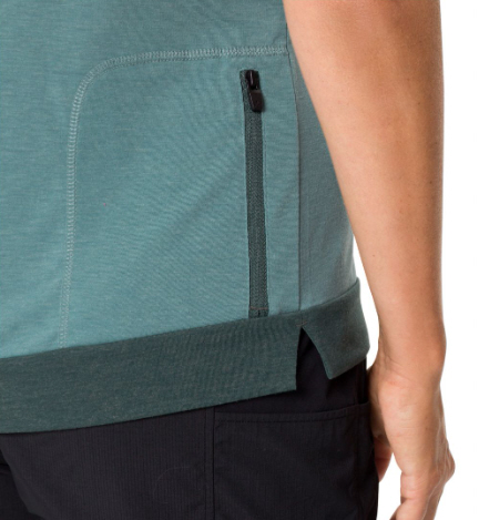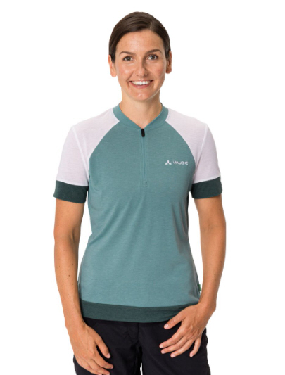 Un classique du VTT VAUDE. Le confortable t-shirt de vélo pour femme avec col montant et court zip frontal a une coupe décontractée, légèrement rafraîchissante et anti-fumée. Tu peux ainsi porter la sensation Monte Altissimo du lac de Garde devant ta porte en fin de journée. Le matériau principal fonctionnel drirelease® est léger et sèche rapidement et la part de laine assure un toucher agréable et naturel et une régulation efficace de la température corporelle. La finition avec des coutures flatlock réduit les frottements désagréables sur la peau. . Dans la petite poche zippée au dos, tu peux ranger des objets de valeur pour un accès rapide. Le tissu certifié selon la norme environnementale stricte bluesign® system est agréablement léger et offre une fonctionnalité maximale. La laine est en outre une matière première renouvelable et préserve ainsi les ressources fossiles.